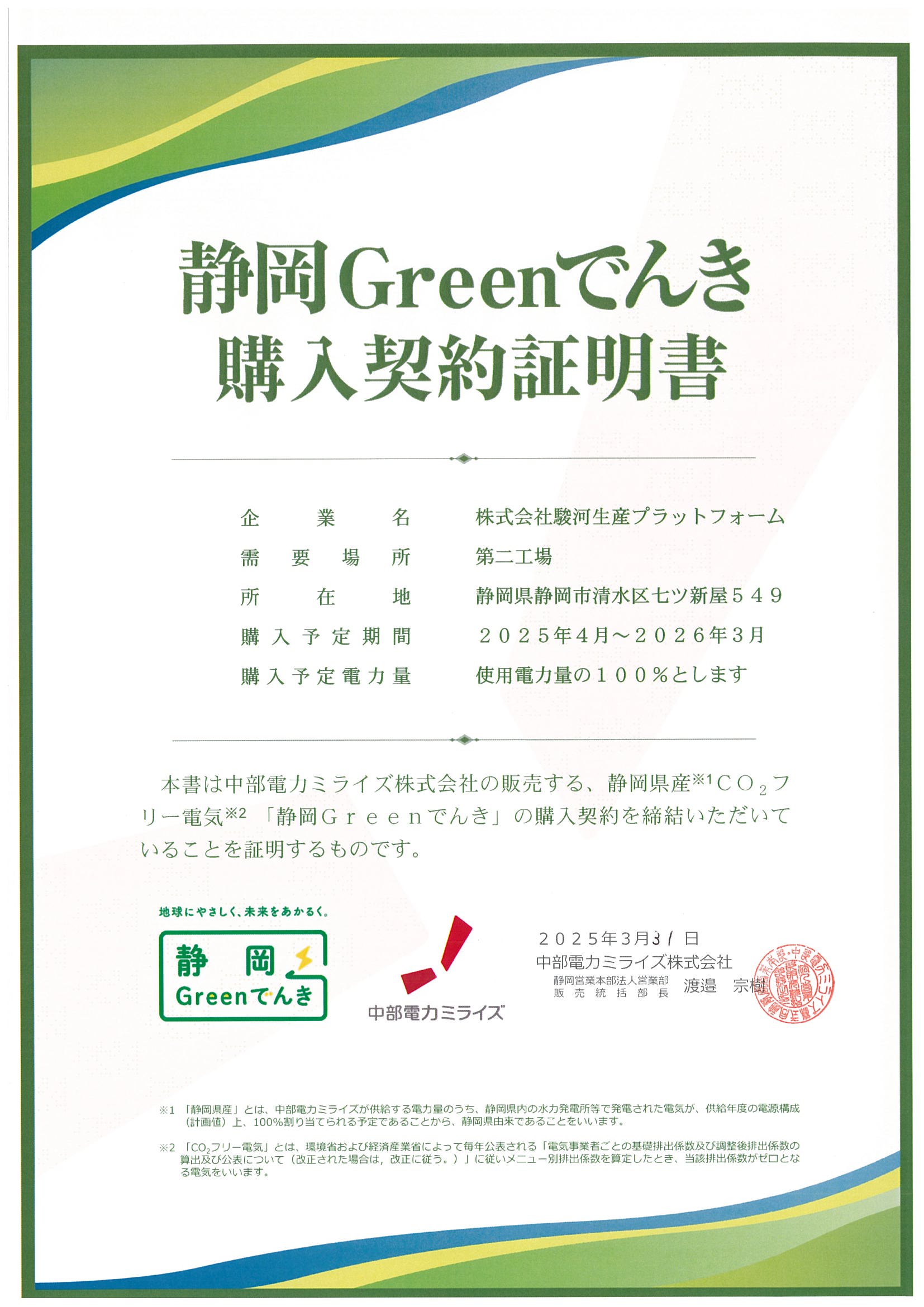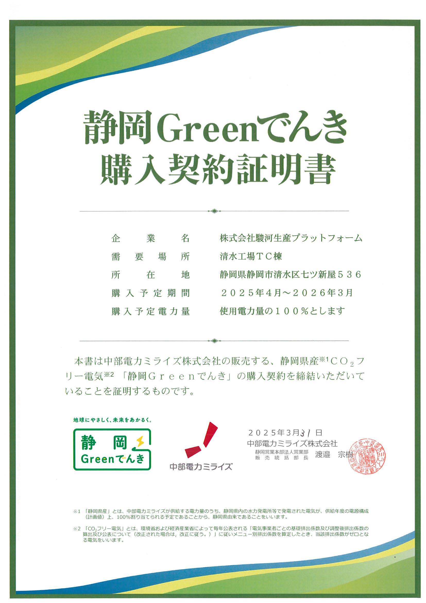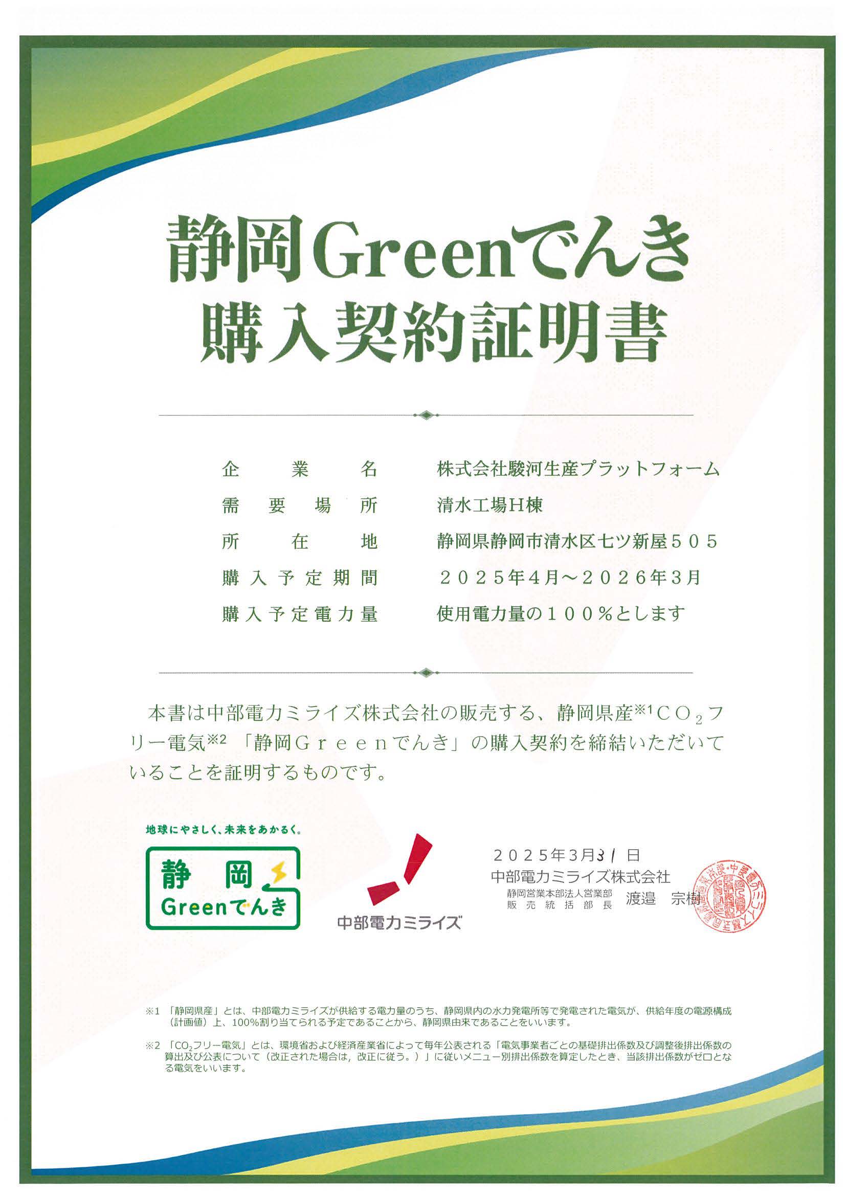 ※ミスミグループホームページの記事はこちら- 当社は静岡県再エネ電気利用促進事業に認定されました