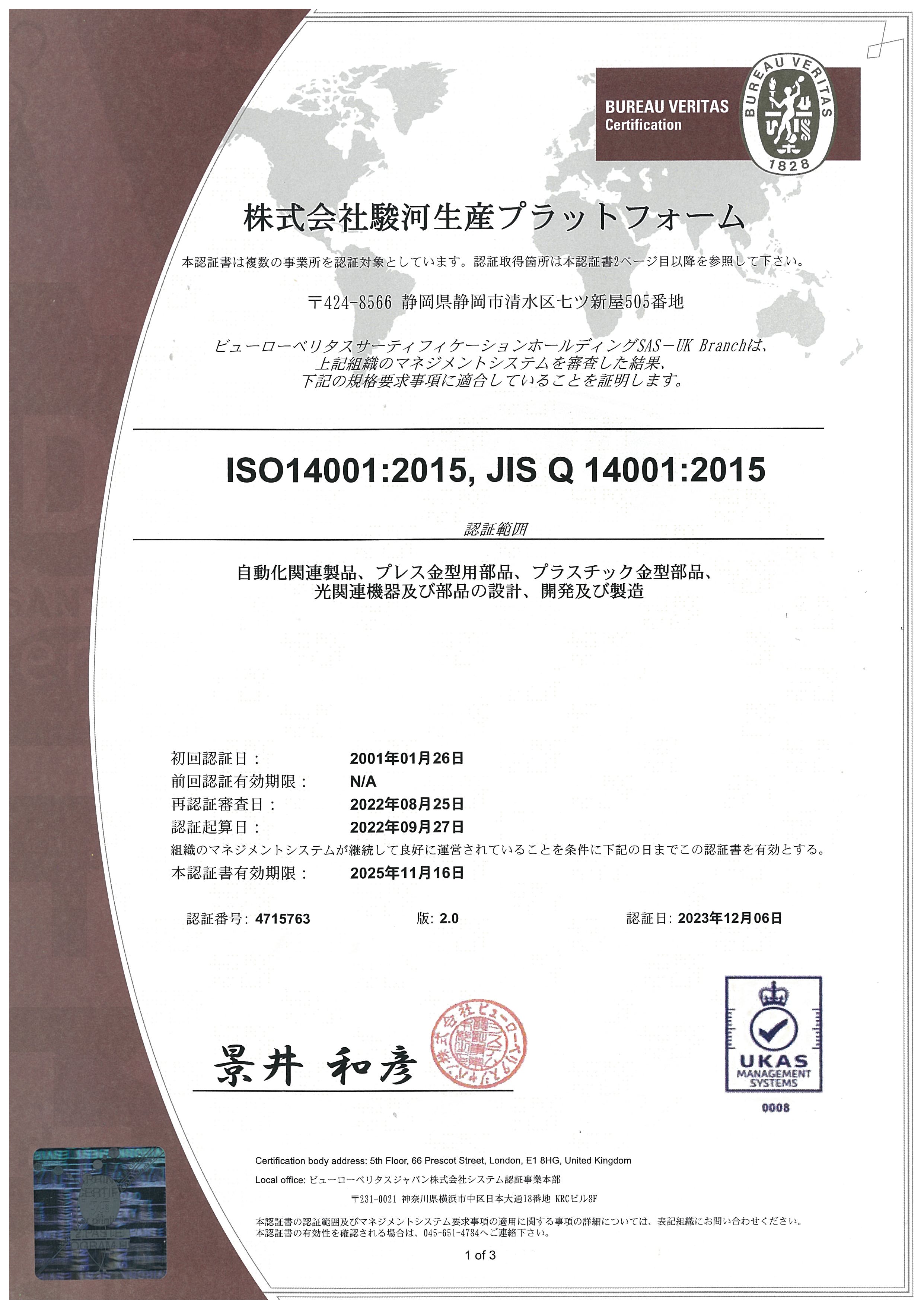 - 2019年10月29日付けで、「ISO14001:2015」の認証を更新しました。