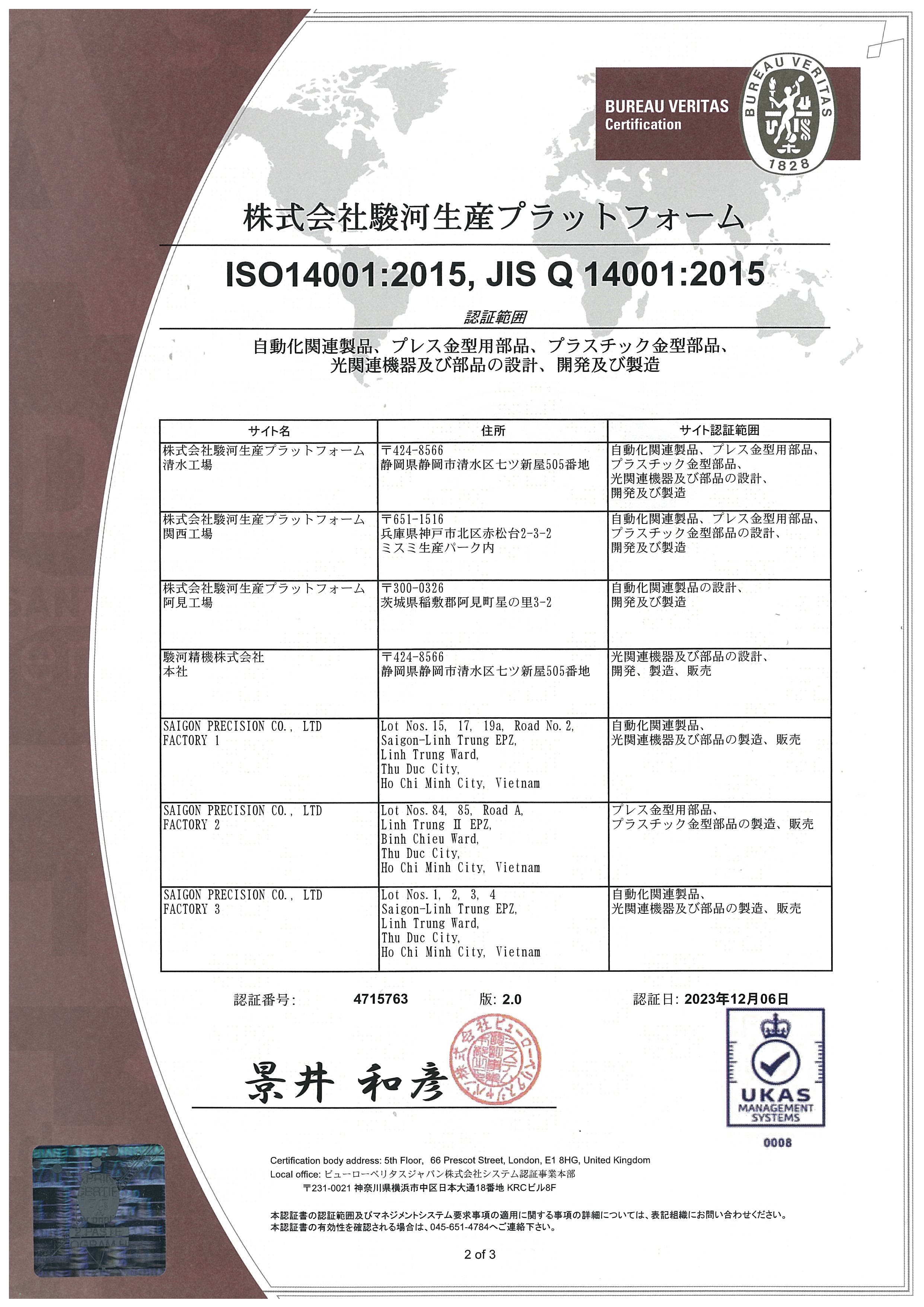 駿河生産プラットフォームは下記国内外工場サイトにてISO14001を取得しております。