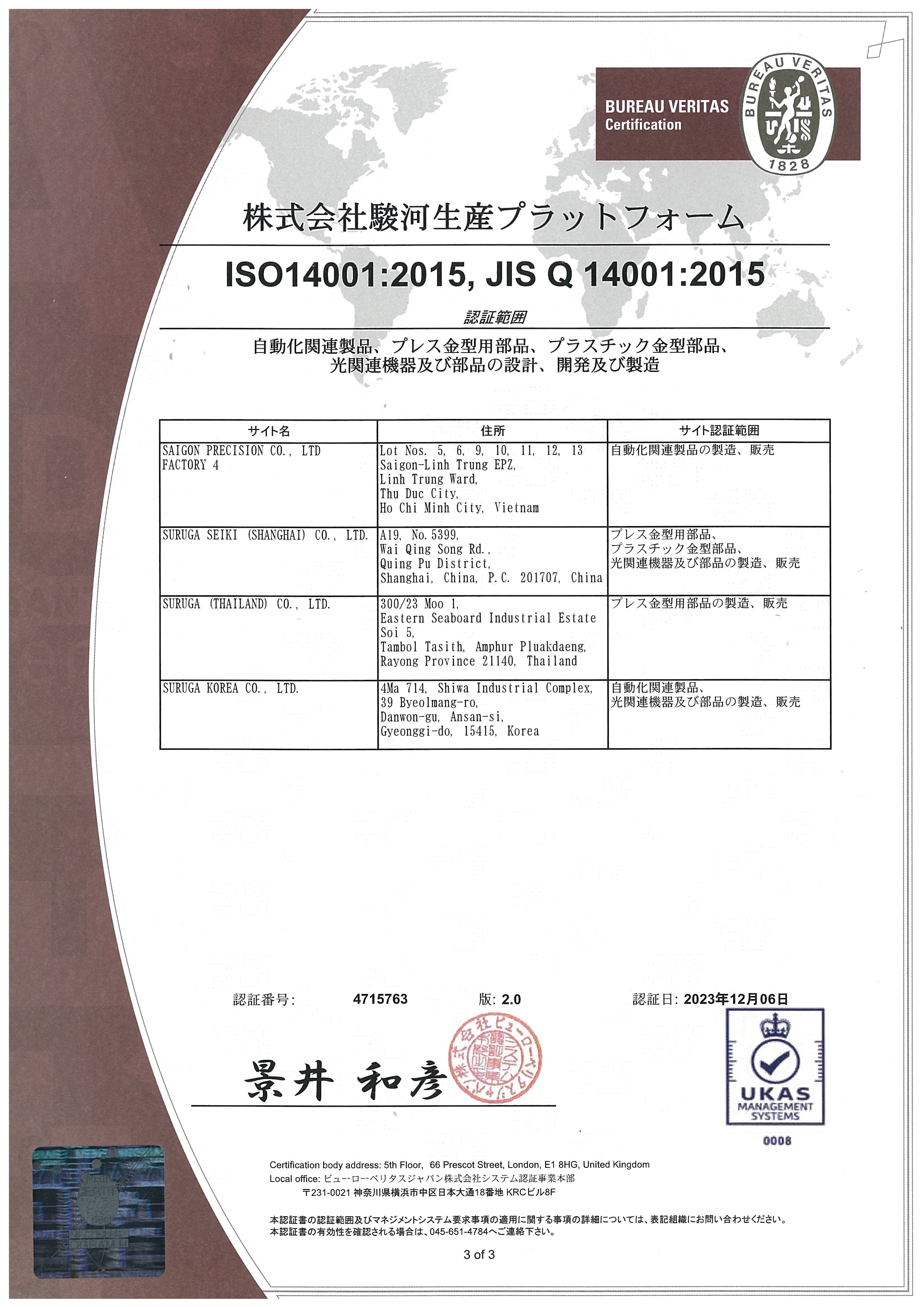 - SURUGA SEIKI (SHANGHAI) CO., LTD.は、2007年5月に統合マネジメントシステムISO14001及び9001を取得しました。