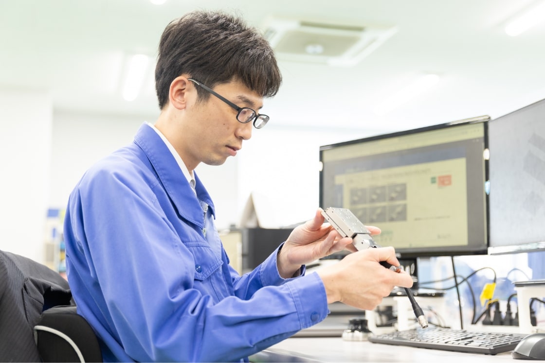 「光関連機器製造事業」という部門で、ステージ技術の仕事に関わっています。ステージ技術というのは、機器の精度を高めるための技術です。たとえばスマートフォンのカメラ。本体の中にカメラを取り付ける基盤が入っていますが、どこに取り付けるかによってカメラの精度が大きく変わります。どこに取り付けるのが最適なのかを決める装置をつくるのが私たちの仕事です。